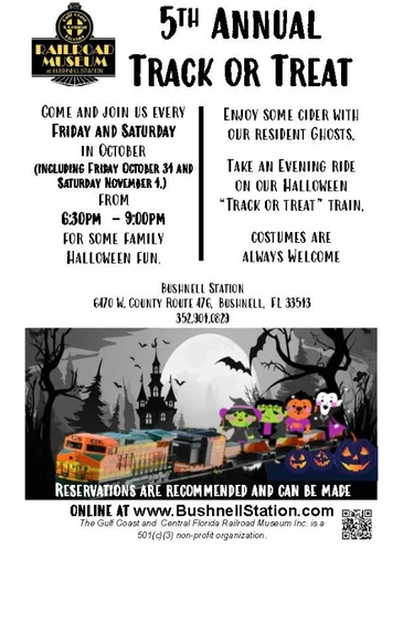 "Track or Treat" every Friday and Saturday night 6:30 PM to 9:00 PM through October!